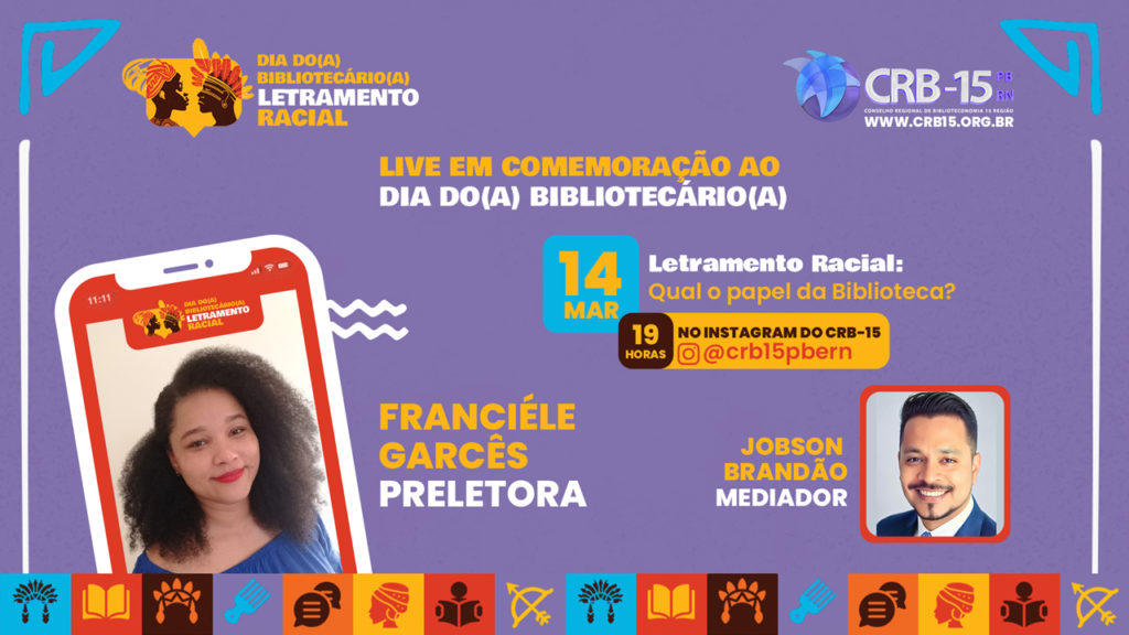 Nesta imperdível conversa, teremos a honra de contar com a mediação do bibliotecário Jobson Brandão, vice-presidente do CRB, e a participação especial da professora Franciéle Garcês. Juntos, iremos explorar o importante papel das bibliotecas no letramento racial e na promoção da diversidade em nossos espaços de leitura.