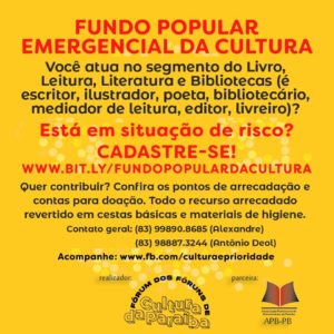 Uma campanha do Fórum dos Fóruns de Cultura da PB que conta com a parceria da Associação Profissional de Bibliotecários da Paraíba para arrecadação de alimentos e doações financeiras a serem destinadas a artistas, mestras/es da cultura popular e trabalhadoras/es de todos os segmentos da cultura paraibana em situação de vulnerabilidade social.