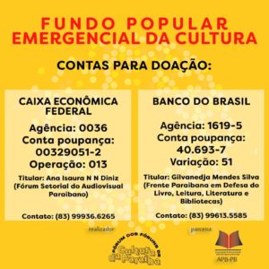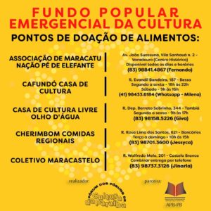 Uma campanha do Fórum dos Fóruns de Cultura da PB que conta com a parceria da Associação Profissional de Bibliotecários da Paraíba para arrecadação de alimentos e doações financeiras a serem destinadas a artistas, mestras/es da cultura popular e trabalhadoras/es de todos os segmentos da cultura paraibana em situação de vulnerabilidade social.